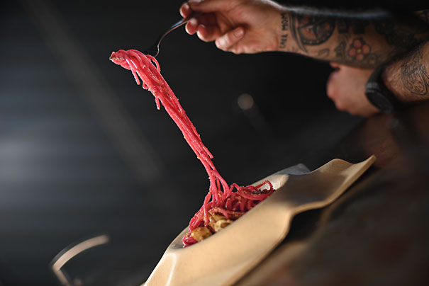 Spaghetti with spinach, black garlic (Chef Hubenov‘s own fermentation)