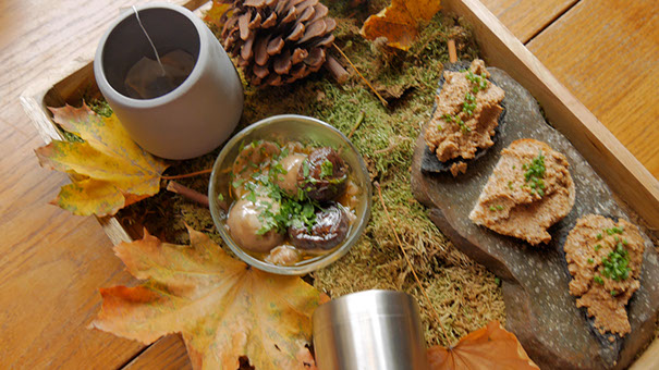 Mushroom trilogy - tartine with mushroom-walnuts-thyme paste; mix of marinated mushrooms; forest tea