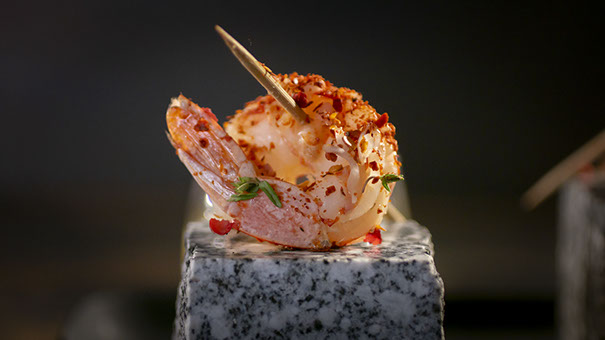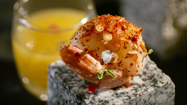 Tomato consommÉ with shrimps and seabass fillet